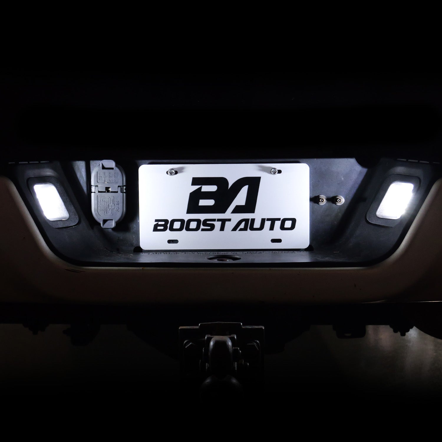Upgrade the look of your truck with Boost Auto’s LED License Plate Light Kit for 2010-2018 4th Gen Ram 2500/3500 trucks. Designed for a perfect factory fit, this kit replaces the dull, yellow factory bulbs with crisp, bright white LEDs that are 15 times brighter for a modern look and improved rear visibility.