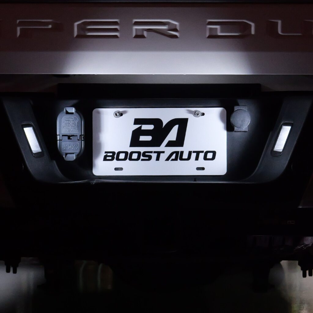 Upgrade the look of your truck with Boost Auto’s LED License Plate Light Kit for the 2017-2022 Ford Super Duty. Designed for a perfect factory fit, this kit replaces the dull, yellow factory bulbs with crisp, bright white LEDs that are 15 times brighter for a modern look and improved rear visibility.