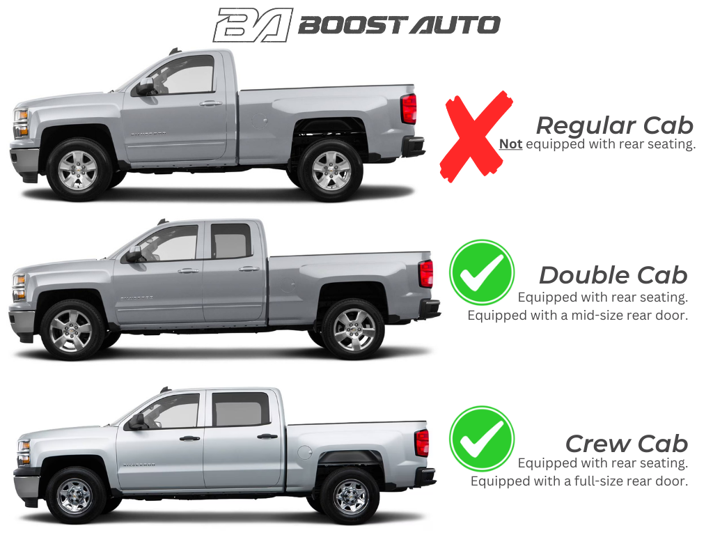 Double Cab (also known as extended cab) trucks allow for rear seating without a full-size rear door. Crew Cab trucks allow for rear seating with a full-size rear door. Crew cab trucks offer a larger cabin area than double cabs. Please review the below graphic depicting the difference between styles of cabins.