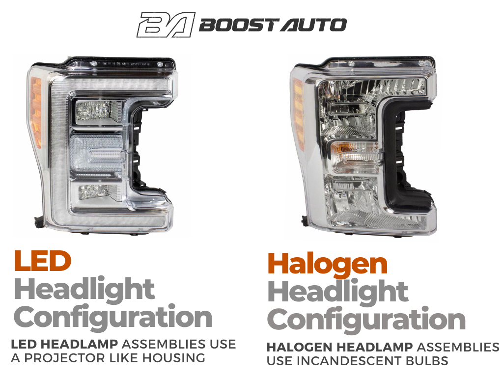 Halogen headlights will use an incandescent bulb which tends to have a yellow beam pattern. LED headlights will have a cool white beam pattern. Please reference the below graphic depicting the visual difference between Halogen and LED headlights.
