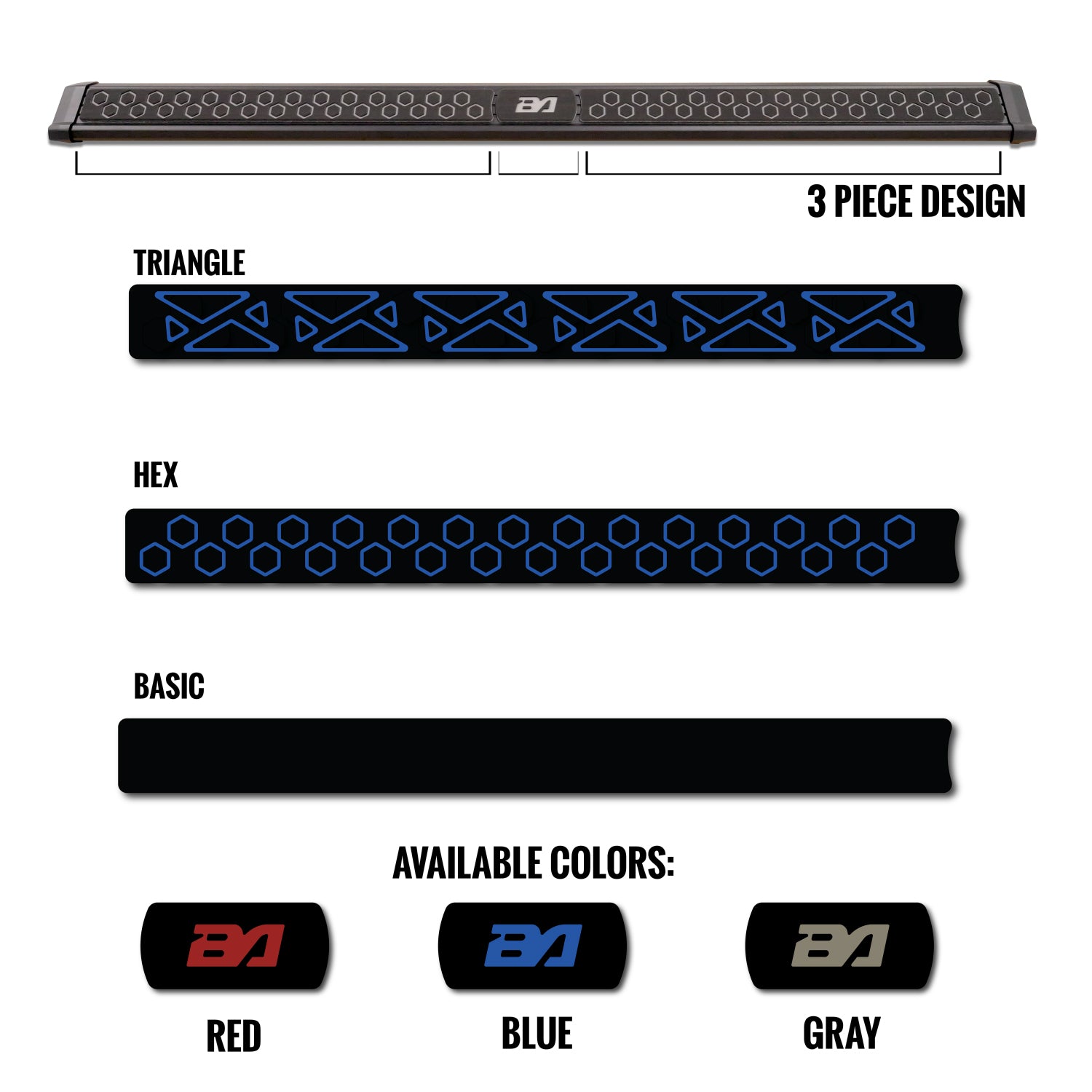 Boost Auto Step Pads for Lumastep M2 Powered Light Up Running Boards come in three unique design options (Triangle, Hex, Basic) and three different color options (Blue, Grey, Red). You can take a closer look at the available designs in the below graphic.