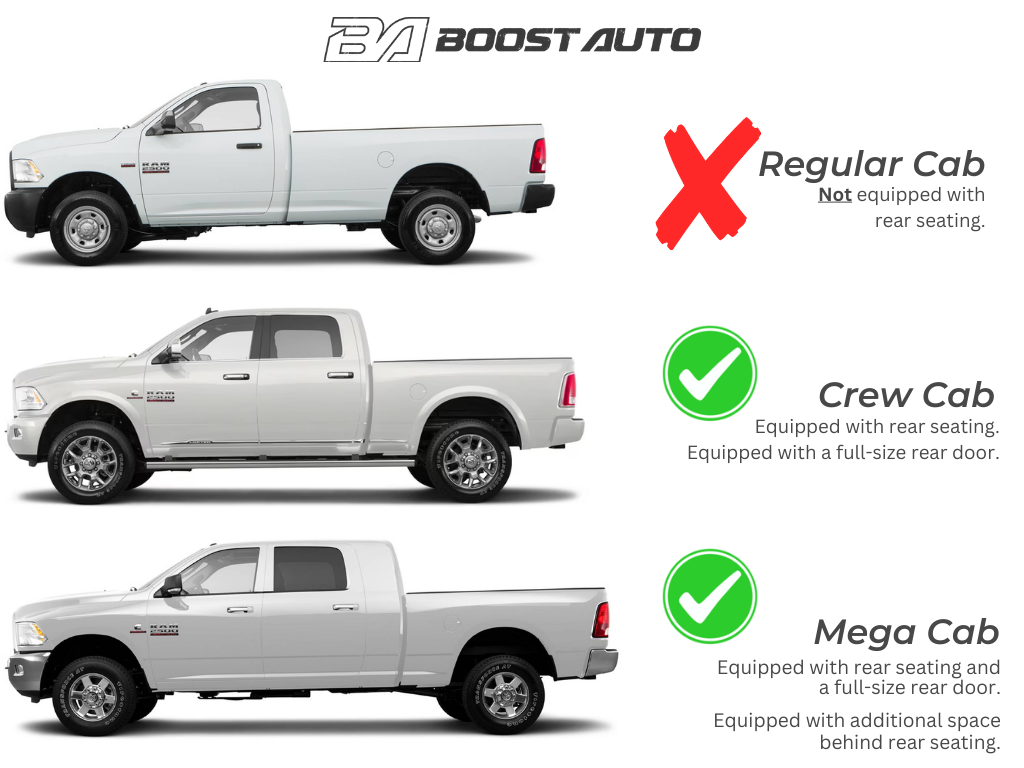 Crew Cab trucks allow for rear seating with a full-size rear door. Mega Cab trucks allow for rear seating with a full-size rear door plus additional space behind the rear seating. Mega Cab trucks offer a larger cabin area than Crew Cabs. Please review the below graphic depicting the difference between styles of cabins.