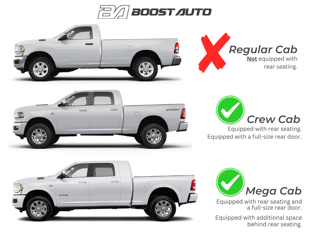 Crew Cab trucks allow for rear seating with a full-size rear door. Mega Cab trucks allow for rear seating with a full-size rear door plus additional space behind the rear seating. Mega Cab trucks offer a larger cabin area than Crew Cabs. Please review the below graphic depicting the difference between styles of cabins.