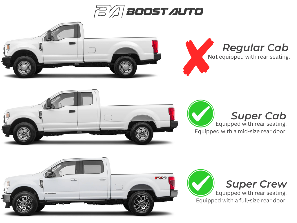 Super Cab (also known as extended cab) trucks allow for rear seating without a full-size rear door. Super Crew trucks allow for rear seating with a full-size rear door. Super Crew trucks offer a larger cabin area than Super Cabs. Please review the below graphic depicting the difference between styles of cabins.