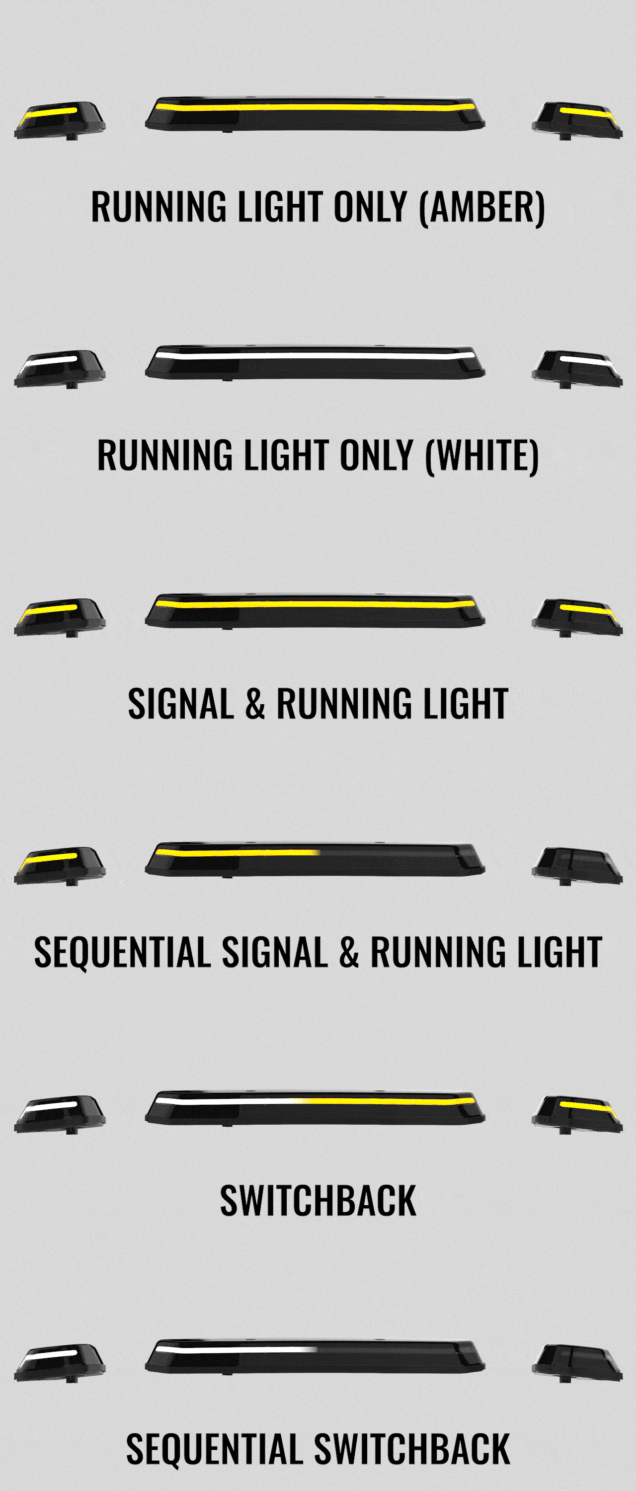 If you choose Sequential Switchback the lights will illuminate as a white running light, and scan as an amber turn signal. Further explained, if you just have the running lights on, the light will be a solid white strip. If you activate the turn signal while the running lights are on, the solid white light will turn off on the side you are using your signal for, and the amber light will scan. After the signal turns off the white light will turn back on. If your running lights are off the amber signal light will scan like a normal signal.