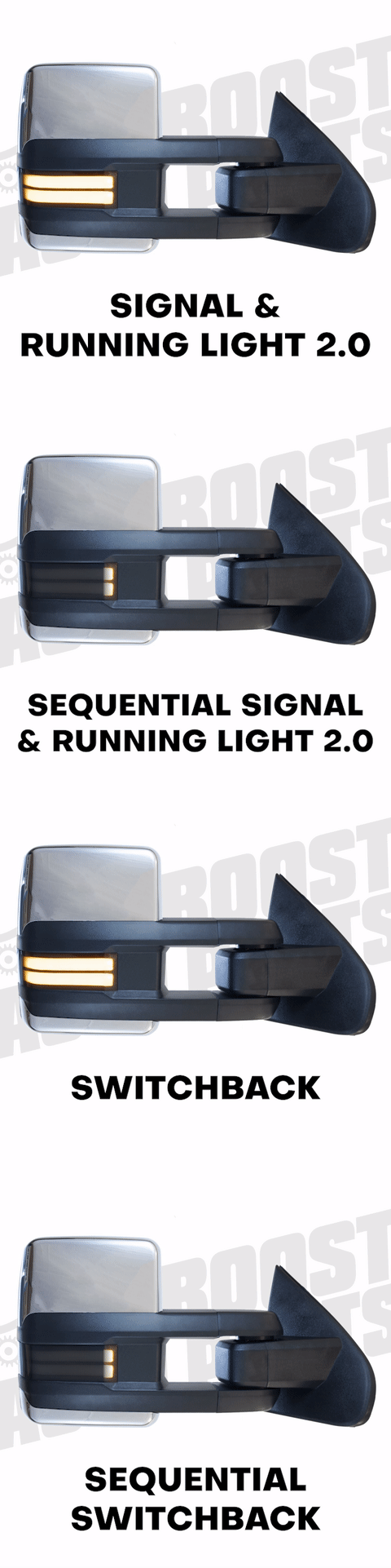Upgrade your truck with Boost Auto's drop-in replacement switchback marker lights, designed for the 2015 style GM tow mirrors and compatible with 2014-2019 Chevy Silverado and GMC Sierra models. These lights can be customized to illuminate as either a White or Amber LED strip with your running lights, and they flash as an amber LED strip for turn signals. Choose between a standard flashing option or a dynamic sequential scanning turn signal for a sleek look.You can option these lights to be painted to your truck's factory color. We use your VIN and paint code to match the color exactly to your factory paint.
